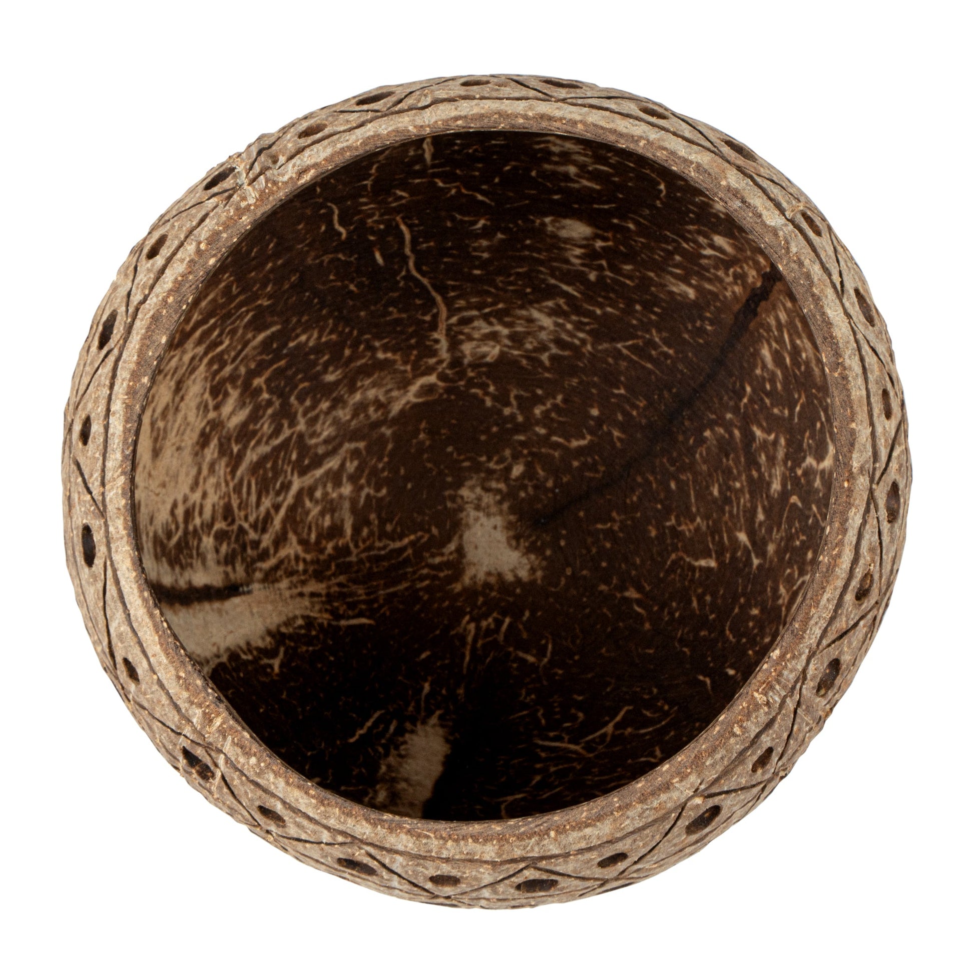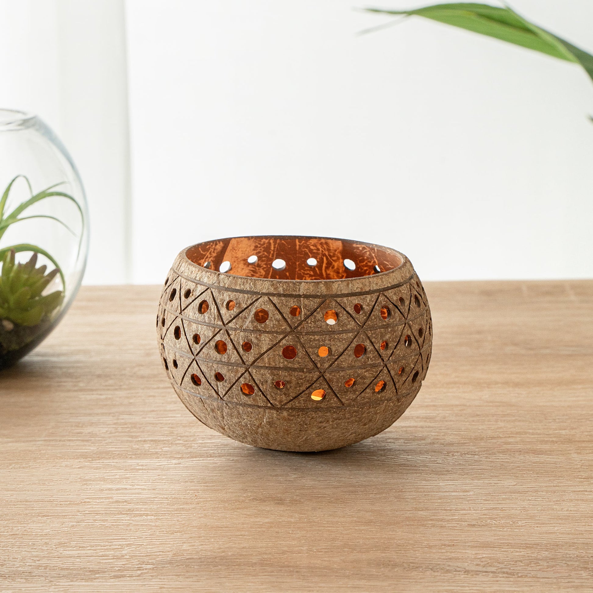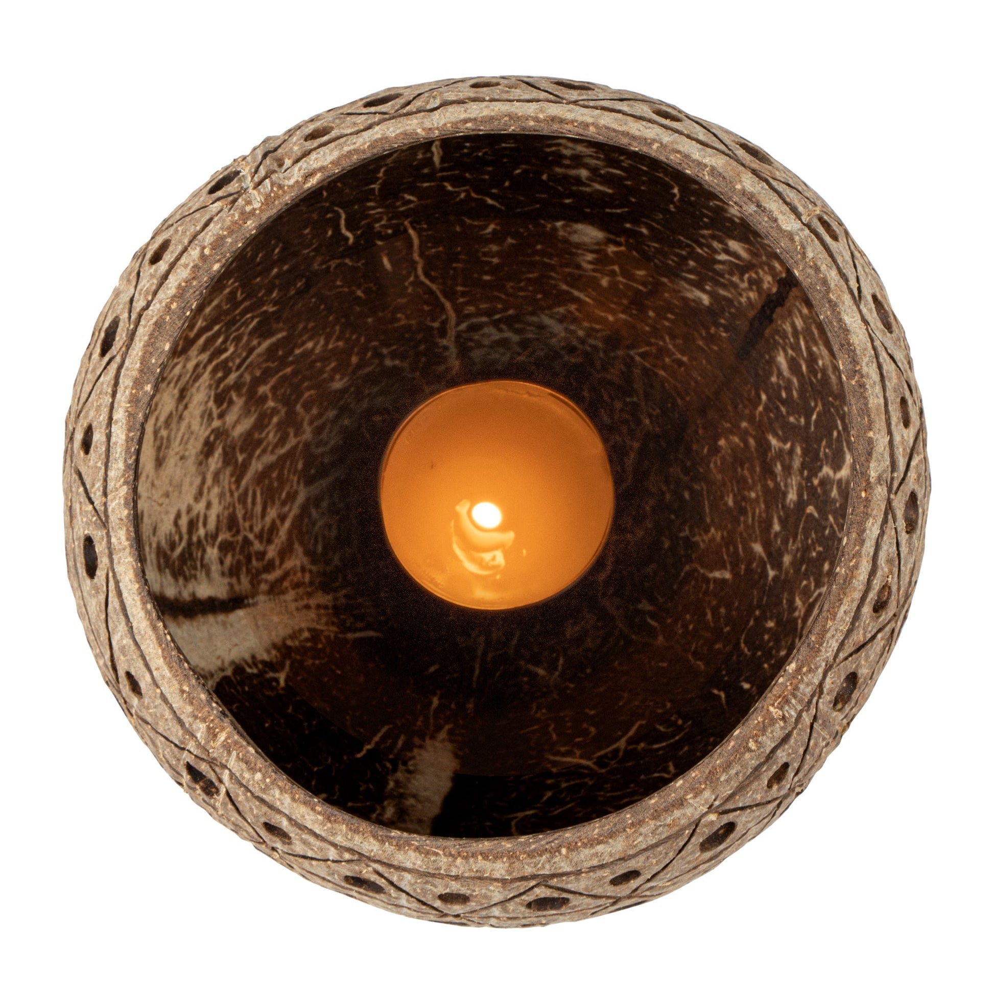 Coco Casa Tan Handmade Coconut Shell Candle Holder - Geometric Pattern - 4" x 4" x 3 1/4" - 10 count box